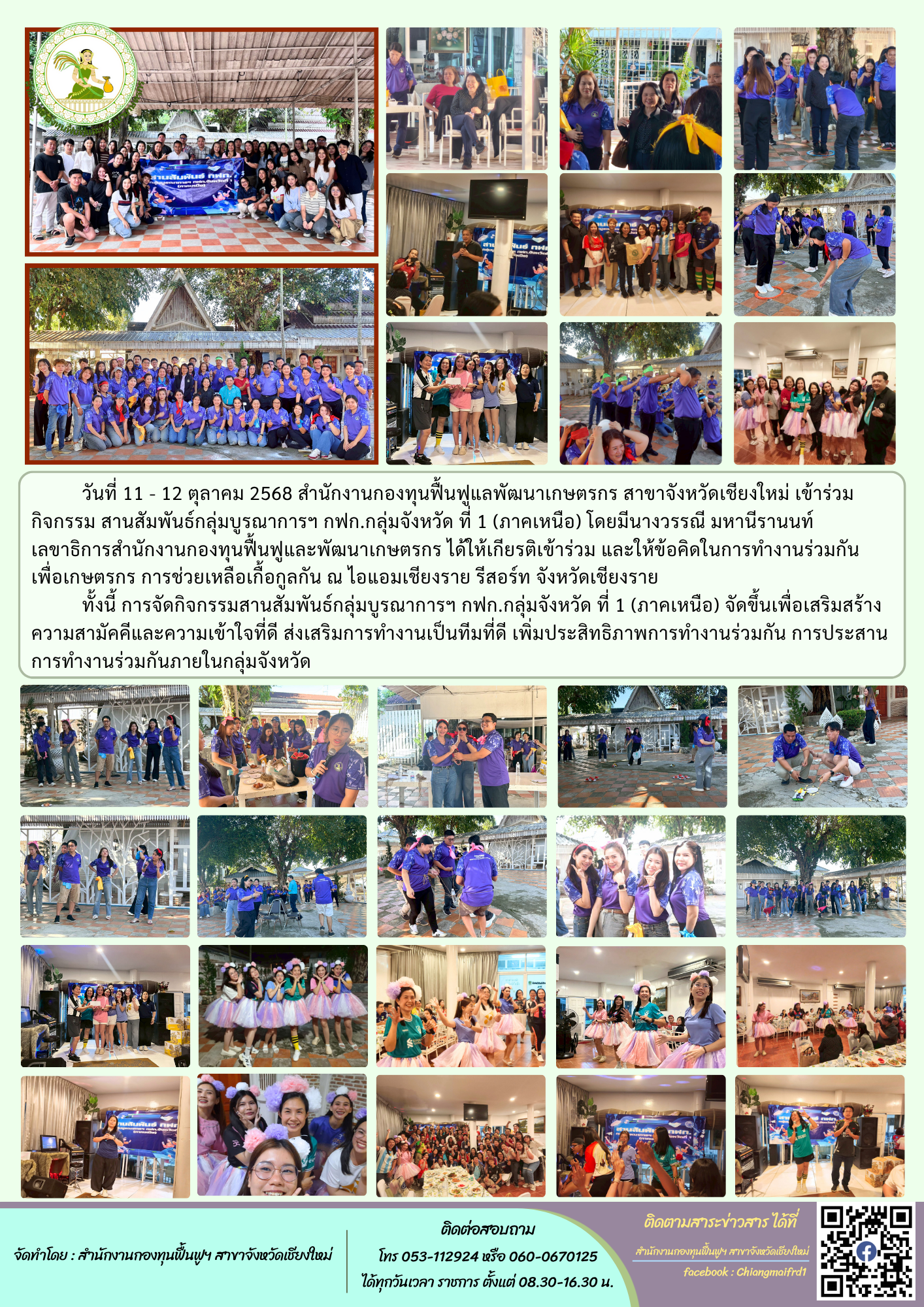 วันที่ 11 – 12 ตุลาคม 2568 สำนักงานกองทุนฟื้นฟูแลพัฒนาเกษตรกร สาขาจังหวัดเชียงใหม่ เข้าร่วมกิจกรรม สานสัมพันธ์กลุ่มบูรณาการฯ กฟก.กลุ่มจังหวัด ที่ 1 (ภาคเหนือ) โดยมีนางวรรณี มหานีรานนท์ เลขาธิการสำนักงานกองทุนฟื้นฟูและพัฒนาเกษตรกร ได้ให้เกียรติเข้าร่วม และให้ข้อคิดในการทำงานร่วมกัน เพื่อเกษตรกร การช่วยเหลือเกื้อกูลกัน ณ ไอแอมเชียงราย รีสอร์ท จังหวัดเชียงราย