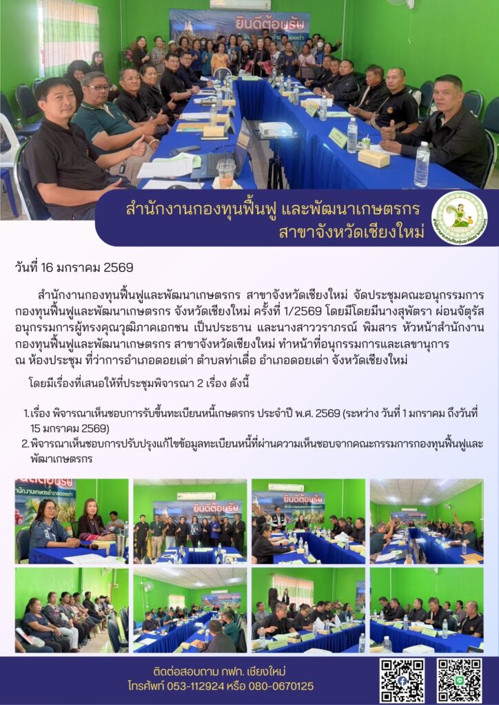 วันที่ 16 มกราคม 2569 สำนักงานกองทุนฟื้นฟู​และพัฒนาเกษตรกร สาขาจังหวัดเชียงใหม่ จัดประชุมคณะอนุกรรมการฯสัญจร พบปะพี่น้องเกษตรกรในพื้นที่อำเภอดอยเต่า เพื่อประชาสัมพันธ์ภารกิจกองทุนฟื้นฟูและพัฒนาเกษตรกร ครั้งที่ 1/2569