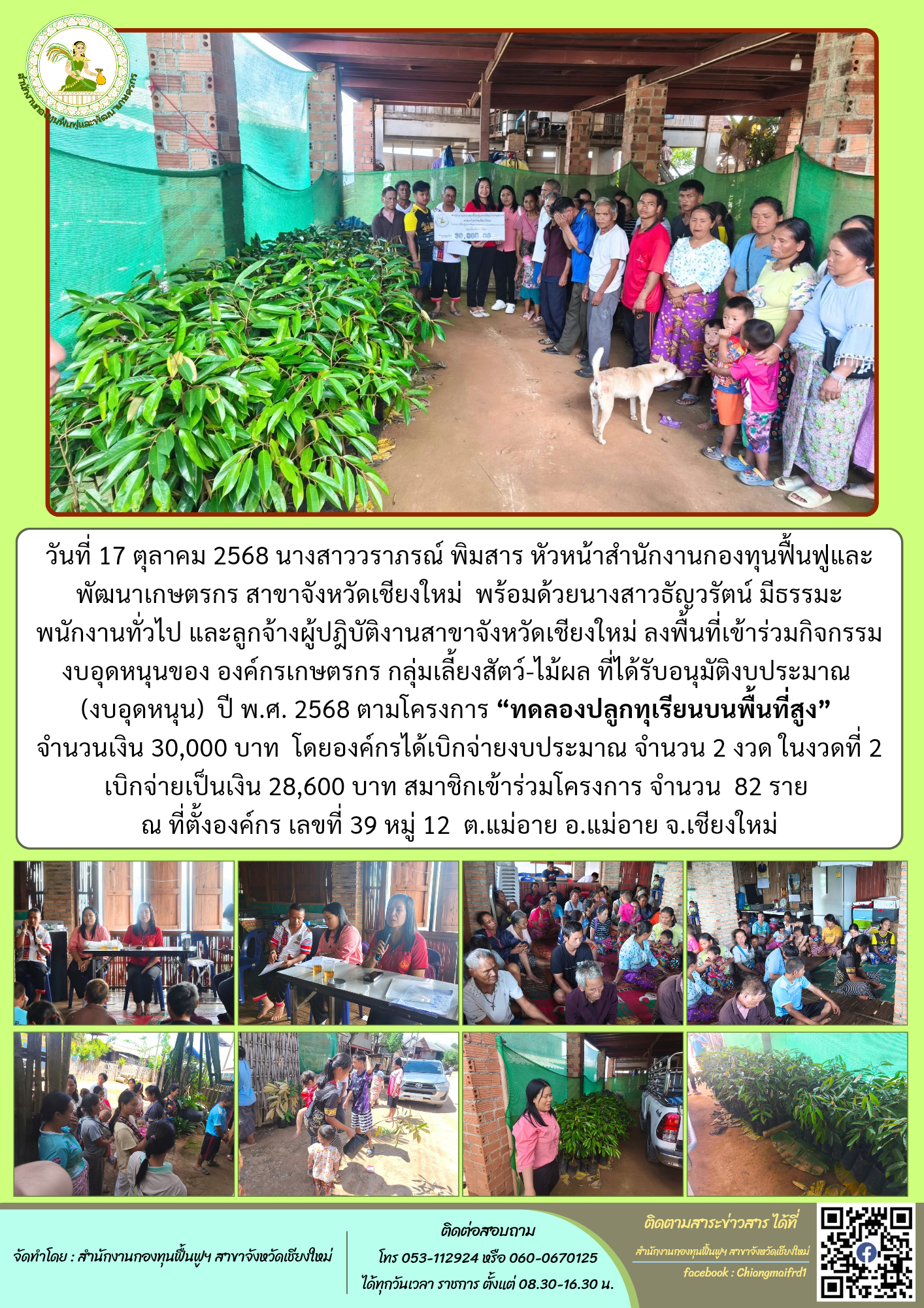 วันที่ 17 ตุลาคม 2568 นางสาววราภรณ์ พิมสาร หัวหน้าสำนักงานกองทุนฟื้นฟูและพัฒนาเกษตรกร สาขาจังหวัดเชียงใหม่ พร้อมด้วยนางสาวธัญวรัตน์ มีธรรมะ พนักงานทั่วไป และลูกจ้างผู้ปฎิบัติงานสาขาจังหวัดเชียงใหม่ ลงพื้นที่เข้าร่วมกิจกรรมงบอุดหนุนของ องค์กรเกษตรกร กลุ่มเลี้ยงสัตว์-ไม้ผล ที่ได้รับอนุมัติงบประมาณ (งบอุดหนุน) ปี พ.ศ. 2568 ตามโครงการ “ทดลองปลูกทุเรียนบนพื้นที่สูง” จำนวนเงิน 30,000 บาท โดยองค์กรได้เบิกจ่ายงบประมาณ จำนวน 2 งวด ในงวดที่ 2 เบิกจ่ายเป็นเงิน 28,600 บาท สมาชิกเข้าร่วมโครงการ จำนวน 82 ราย ณ ที่ตั้งองค์กร เลขที่ 39 หมู่ 12 ต.แม่อาย อ.แม่อาย จ.เชียงใหม่