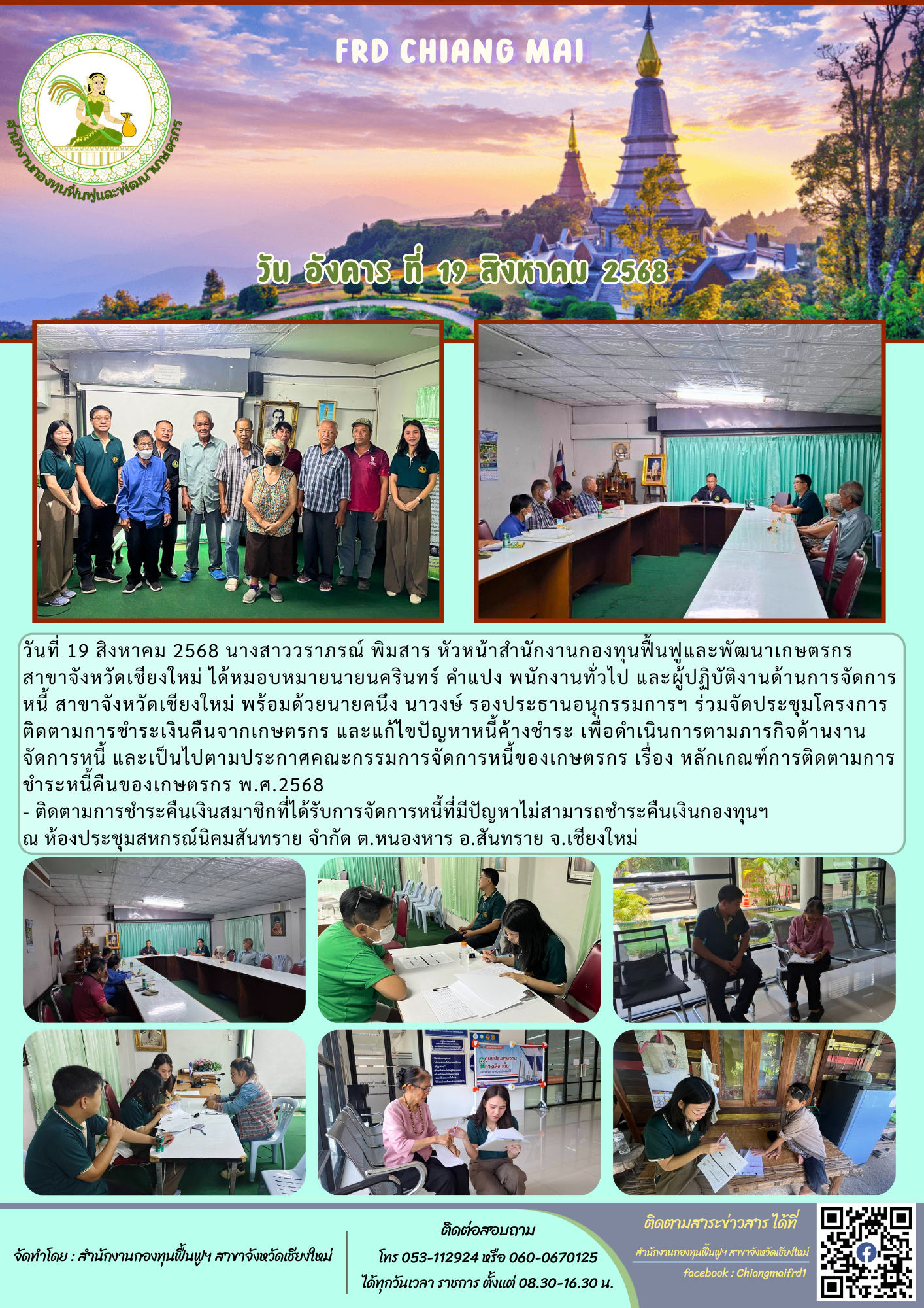 วันที่ 19 สิงหาคม 2568 นางสาววราภรณ์ พิมสาร หัวหน้าสำนักงานกองทุนฟื้นฟูและพัฒนาเกษตรกร สาขาจังหวัดเชียงใหม่ ได้หมอบหมายนายนครินทร์ คำแปง พนักงานทั่วไป และผู้ปฏิบัติงานด้านการจัดการหนี้ สาขาจังหวัดเชียงใหม่ พร้อมด้วยนายคนึง นาวงษ์ รองประธานอนุกรรมการฯ ร่วมจัดประชุมโครงการติดตามการชำระเงินคืนจากเกษตรกร และแก้ไขปัญหาหนี้ค้างชำระ เพื่อดำเนินการตามภารกิจด้านงานจัดการหนี้ และเป็นไปตามประกาศคณะกรรมการจัดการหนี้ของเกษตรกร เรื่อง หลักเกณฑ์การติดตามการชำระหนี้คืนของเกษตรกร พ.ศ.2568