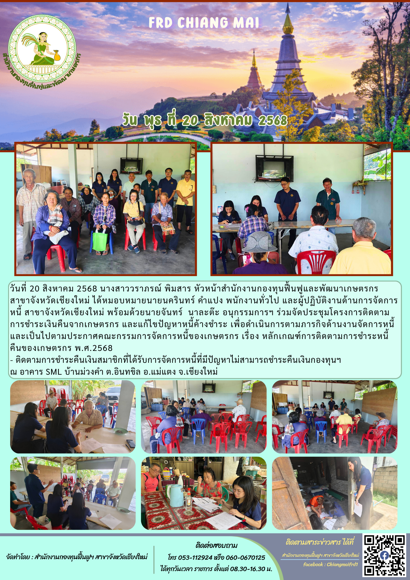 วันที่ 20 สิงหาคม 2568 นางสาววราภรณ์ พิมสาร หัวหน้าสำนักงานกองทุนฟื้นฟูและพัฒนาเกษตรกร สาขาจังหวัดเชียงใหม่ ได้หมอบหมายนายนครินทร์ คำแปง พนักงานทั่วไป และผู้ปฏิบัติงานด้านการจัดการหนี้ สาขาจังหวัดเชียงใหม่ พร้อมด้วยนายจันทร์ นาละต๊ะ อนุกรรมการฯ ร่วมจัดประชุมโครงการติดตามการชำระเงินคืนจากเกษตรกร และแก้ไขปัญหาหนี้ค้างชำระ เพื่อดำเนินการตามภารกิจด้านงานจัดการหนี้ และเป็นไปตามประกาศคณะกรรมการจัดการหนี้ของเกษตรกร เรื่อง หลักเกณฑ์การติดตามการชำระหนี้คืนของเกษตรกร พ.ศ.2568