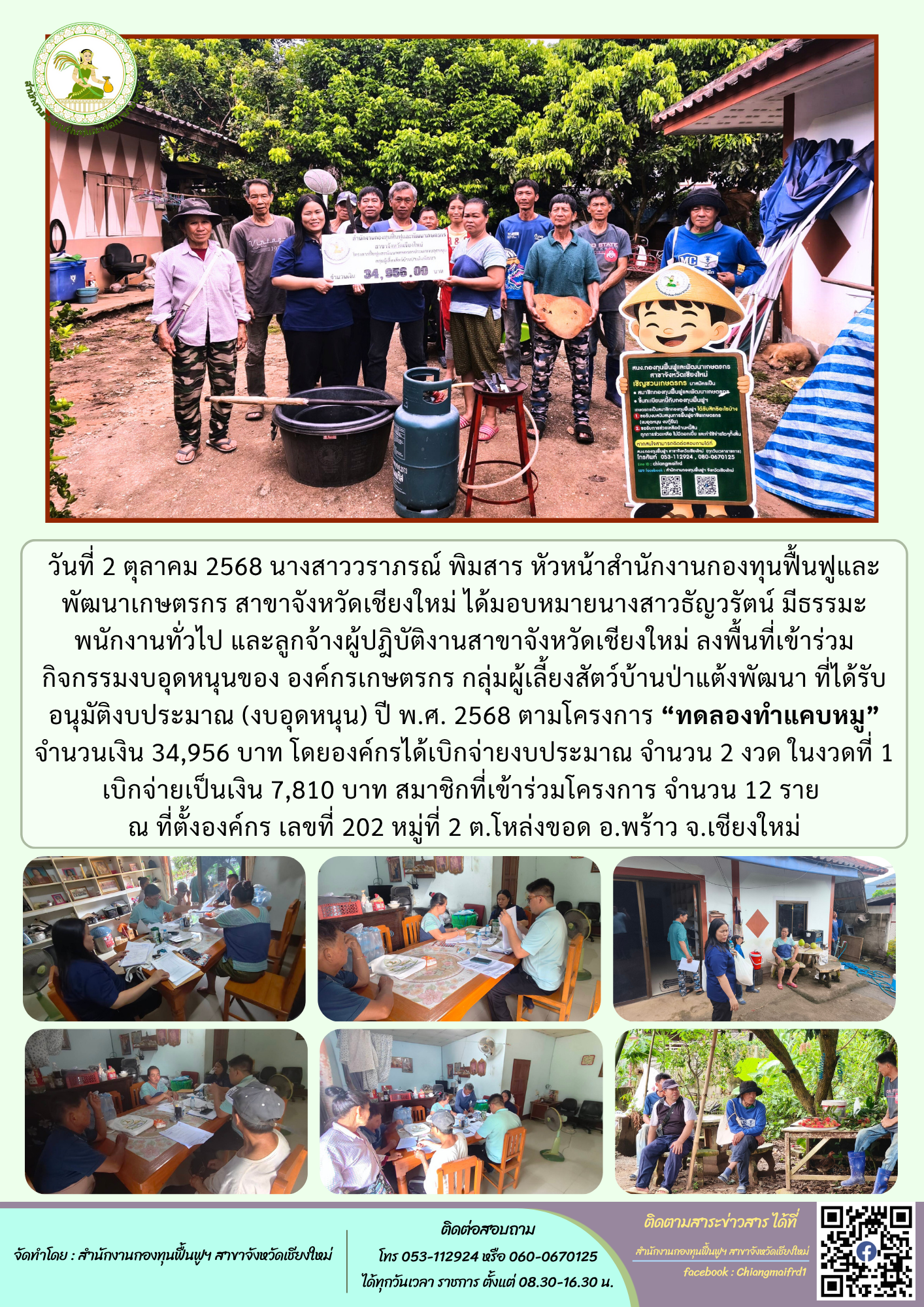 วันที่ 2 ตุลาคม 2568 นางสาววราภรณ์ พิมสาร หัวหน้าสำนักงานกองทุนฟื้นฟูและพัฒนาเกษตรกร สาขาจังหวัดเชียงใหม่ ได้มอบหมายนางสาวธัญวรัตน์ มีธรรมะ พนักงานทั่วไป และลูกจ้างผู้ปฎิบัติงานสาขาจังหวัดเชียงใหม่ ลงพื้นที่เข้าร่วมกิจกรรมงบอุดหนุนของ องค์กรเกษตรกร กลุ่มผู้เลี้ยงสัตว์บ้านป่าแต้งพัฒนา ที่ได้รับอนุมัติงบประมาณ (งบอุดหนุน) ปี พ.ศ. 2568 ตามโครงการ “ทดลองทำแคบหมู” จำนวนเงิน 34,956 บาท โดยองค์กรได้เบิกจ่ายงบประมาณ จำนวน 2 งวด ในงวดที่ 1 เบิกจ่ายเป็นเงิน 7,810 บาท กับสมาชิกที่เข้าร่วมโครงการ จำนวน 12 ราย ณ ที่ตั้งองค์กร เลขที่ 202 หมู่ที่ 2 ต.โหล่งขอด อ.พร้าว จ.เชียงใหม่