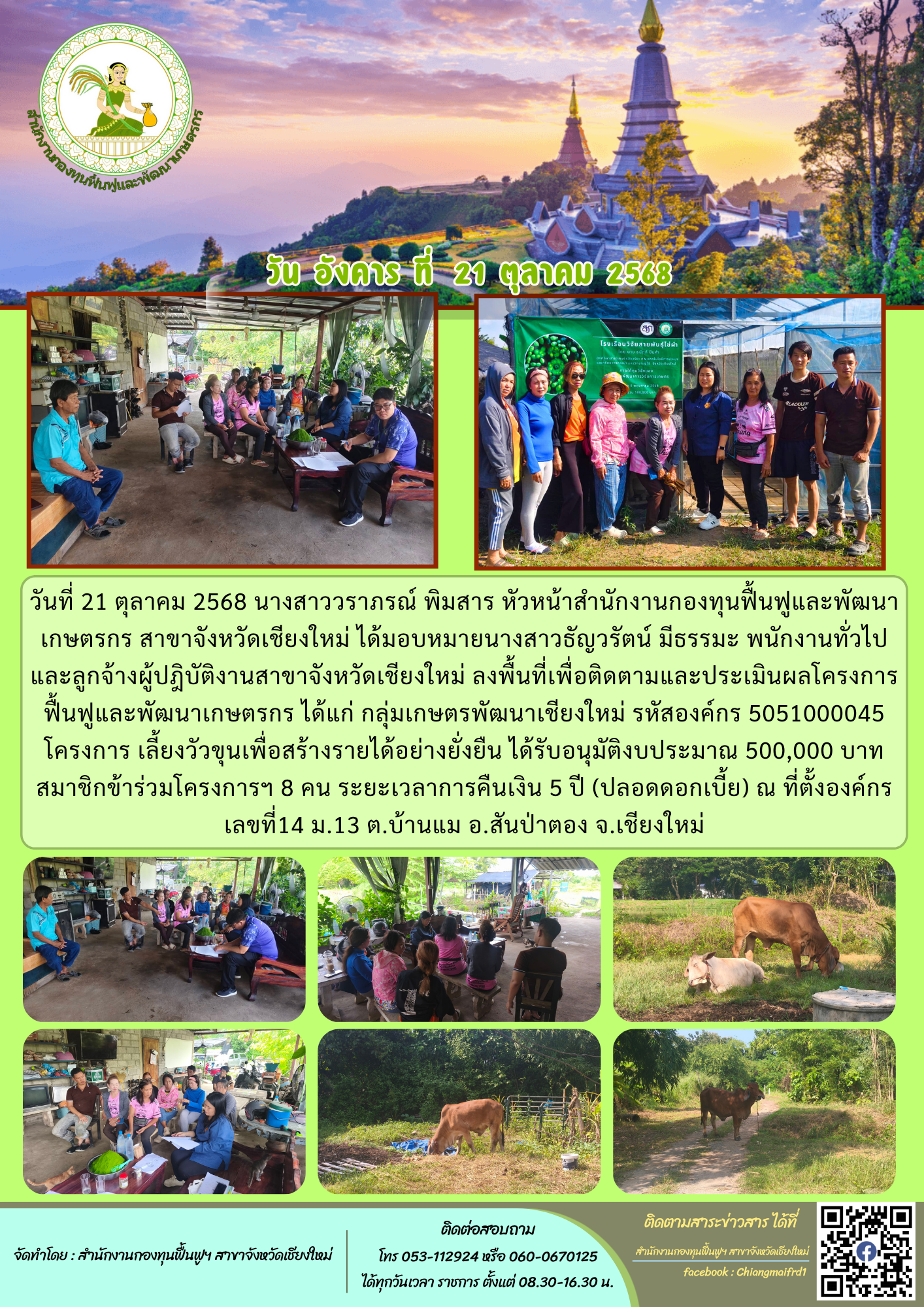 วันที่ 21 ตุลาคม 2568 นางสาววราภรณ์ พิมสาร หัวหน้าสำนักงานกองทุนฟื้นฟูและพัฒนาเกษตรกร สาขาจังหวัดเชียงใหม่ ได้มอบหมายนางสาวธัญวรัตน์ มีธรรมะ พนักงานทั่วไป และลูกจ้างผู้ปฎิบัติงานสาขาจังหวัดเชียงใหม่ ลงพื้นที่เพื่อติดตามและประเมินผลโครงการฟื้นฟูและพัฒนาเกษตรกร ได้แก่ กลุ่มเกษตรพัฒนาเชียงใหม่ รหัสองค์กร 5051000045 โครงการ เลี้ยงวัวขุนเพื่อสร้างรายได้อย่างยั่งยืน ได้รับอนุมัติงบประมาณ 500,000 บาท สมาชิกข้าร่วมโครงการฯ 8 คน ระยะเวลาการคืนเงิน 5 ปี (ปลอดดอกเบี้ย) ณ ที่ตั้งองค์กร เลขที่ 14 ม.13 ต.บ้านแม อ.สันป่าตอง จ.เชียงใหม่