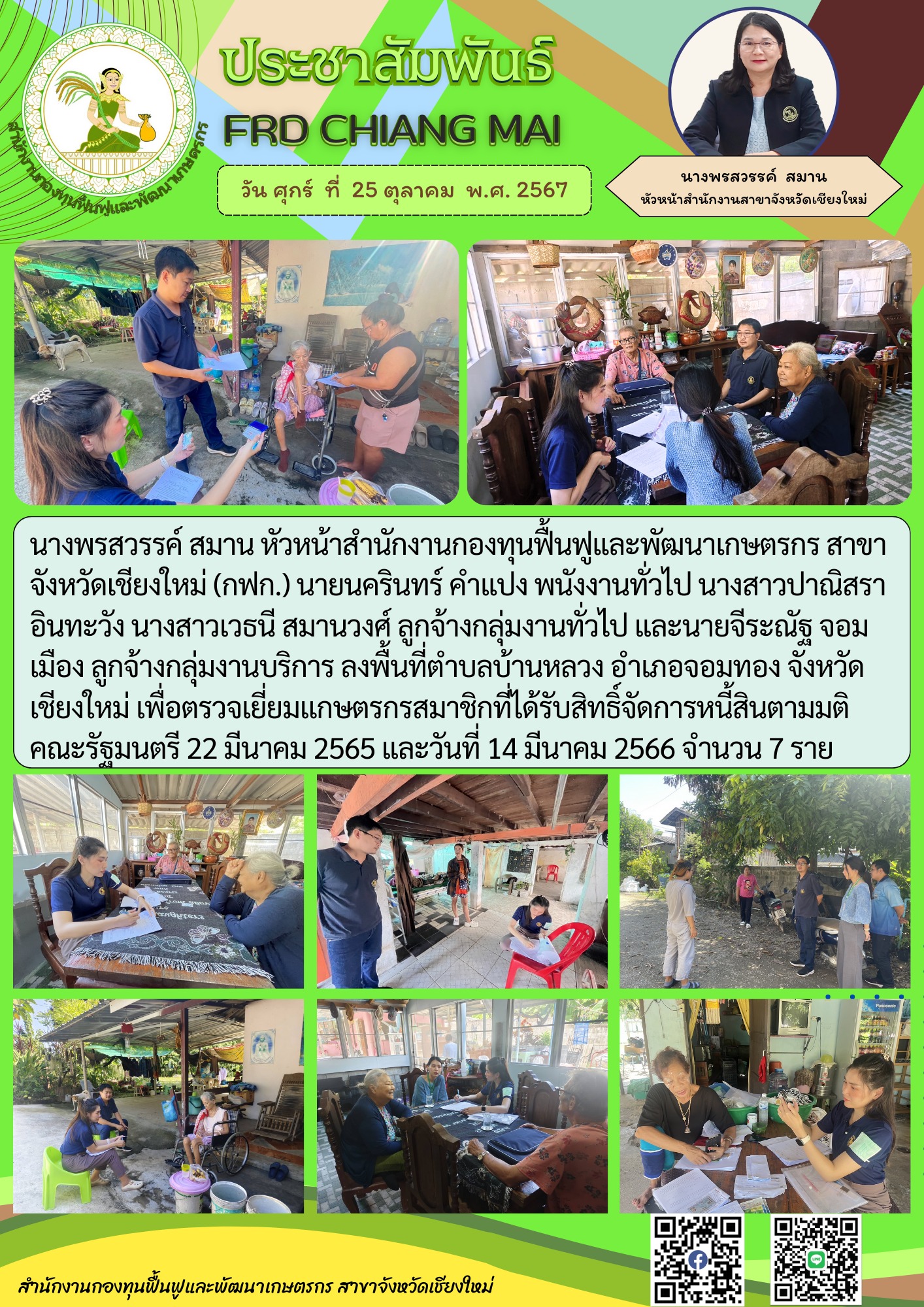 วันที่ 25 ตุลาคม 2567 ลงพื้นที่อำเภอจอมทอง ตรวจเยี่ยมเกษตรกรสมาชิกที่ได้รับสิทธิ์จัดการหนี้สินตามมติคณะรัฐมนตรี 22 มีนาคม 2565 และวันที่ 14 มีนาคม 2566