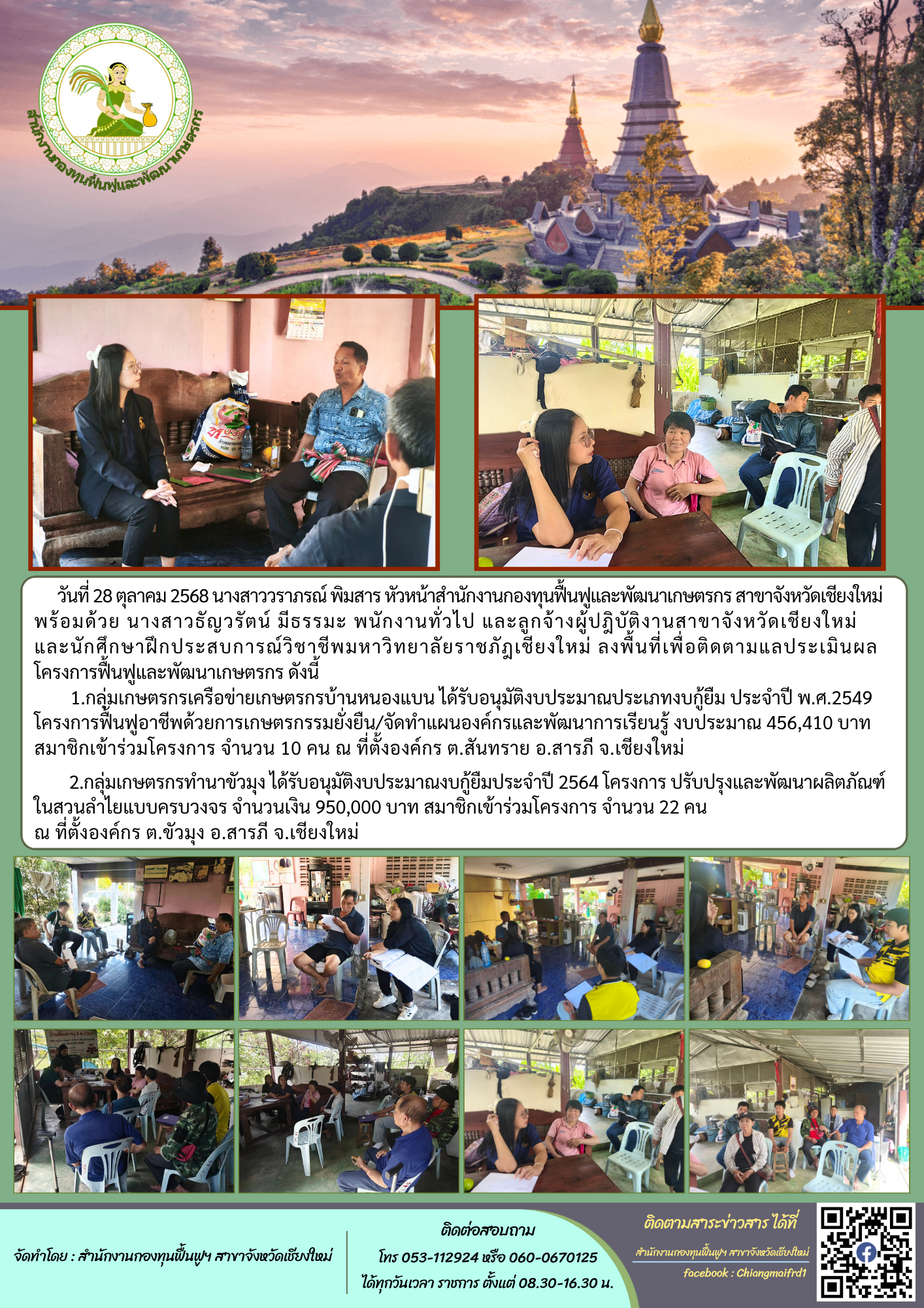 วันที่ 28 ตุลาคม 2568 นางสาววราภรณ์ พิมสาร หัวหน้าสำนักงานกองทุนฟื้นฟูและพัฒนาเกษตรกร สาขาจังหวัดเชียงใหม่พร้อมด้วย นางสาวธัญวรัตน์ มีธรรมะ พนักงานทั่วไป และลูกจ้างผู้ปฎิบัติงานสาขาจังหวัดเชียงใหม่ และนักศึกษาฝึกประสบการณ์วิชาชีพมหาวิทยาลัยราชภัฎเชียงใหม่ ลงพื้นที่เพื่อติดตามแลประเมินผลโครงการฟื้นฟูและพัฒนาเกษตรกร ดังนี้