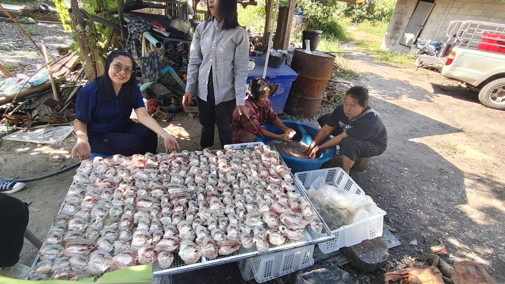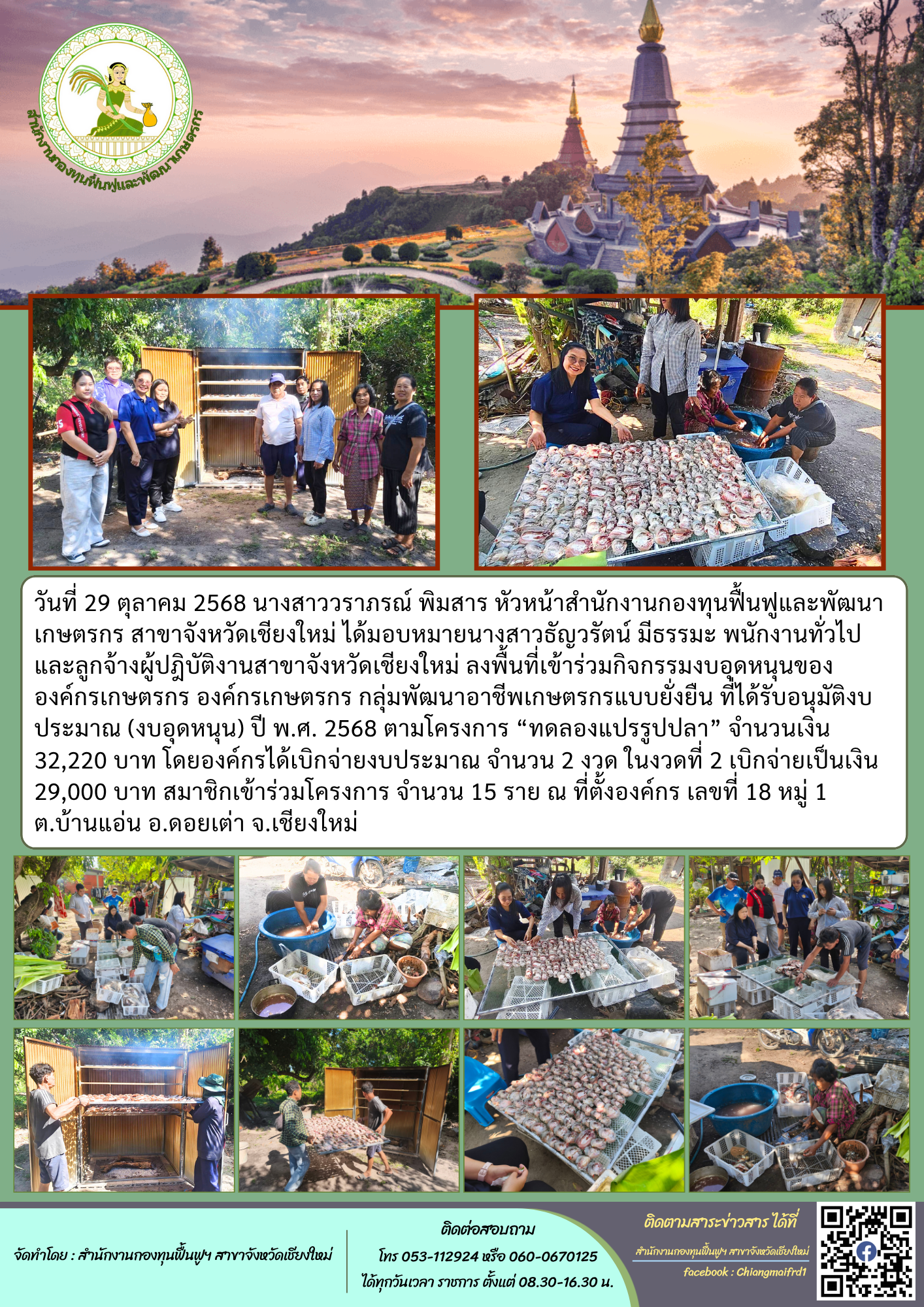 วันที่ 29 ตุลาคม 2568 นางสาววราภรณ์ พิมสาร หัวหน้าสำนักงานกองทุนฟื้นฟูและพัฒนาเกษตรกร สาขาจังหวัดเชียงใหม่ ได้มอบหมายนางสาวธัญวรัตน์ มีธรรมะ พนักงานทั่วไป และลูกจ้างผู้ปฎิบัติงานสาขาจังหวัดเชียงใหม่ ลงพื้นที่เข้าร่วมกิจกรรมงบอุดหนุนของ องค์กรเกษตรกร องค์กรเกษตรกร กลุ่มพัฒนาอาชีพเกษตรกรแบบยั่งยืน ที่ได้รับอนุมัติงบประมาณ (งบอุดหนุน) ปี พ.ศ. 2568 ตามโครงการ “ทดลองแปรรูปปลา” จำนวนเงิน 32,220 บาท โดยองค์กรได้เบิกจ่ายงบประมาณ จำนวน 2 งวด ในงวดที่ 2 เบิกจ่ายเป็นเงิน 29,000 บาท สมาชิกเข้าร่วมโครงการ จำนวน 15 ราย ณ ที่ตั้งองค์กร เลขที่ 18 หมู่ 1 ต.บ้านแอ่น อ.ดอยเต่า จ.เชียงใหม่
