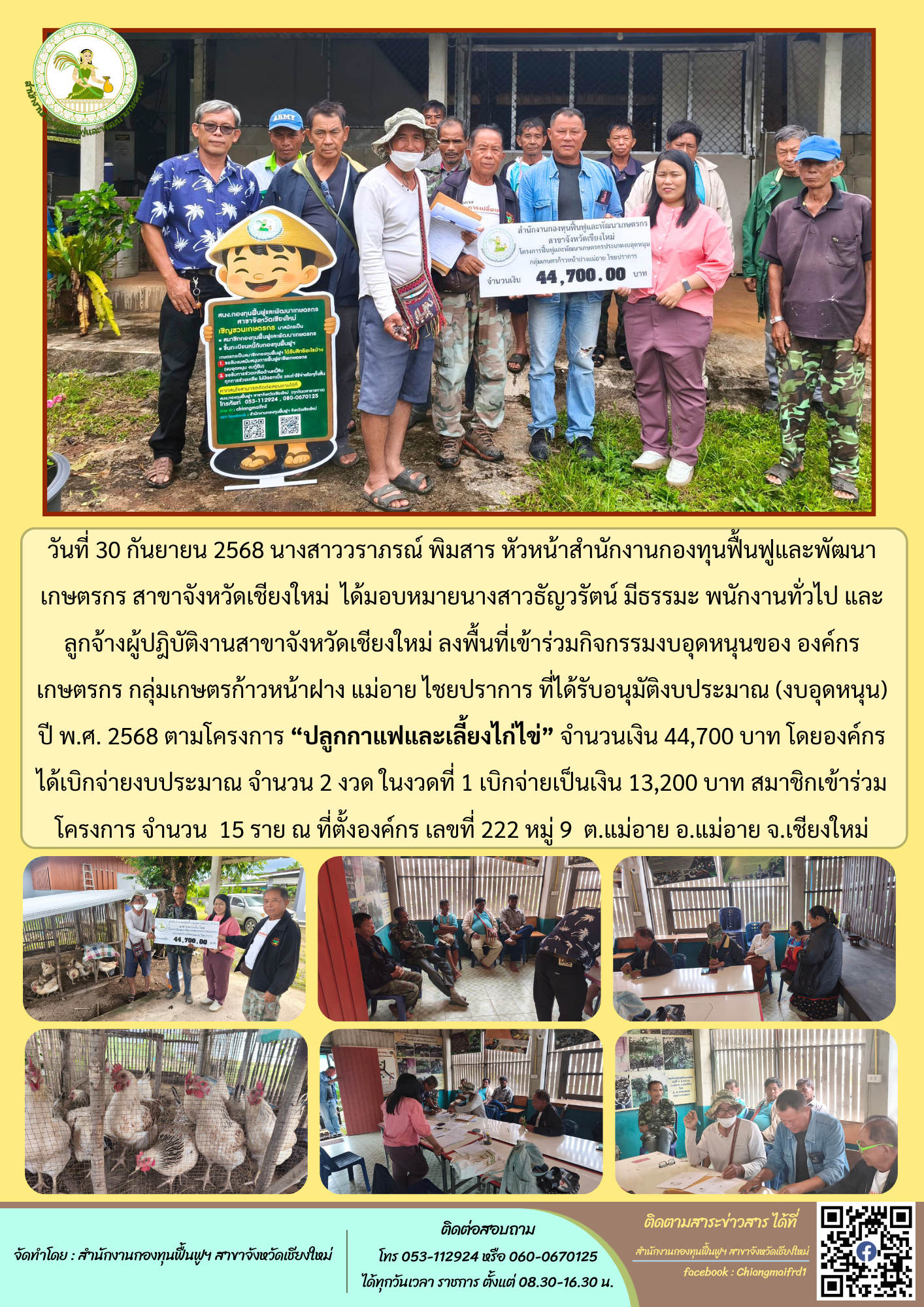 วันที่ 30 กันยายน 2568 นางสาววราภรณ์ พิมสาร หัวหน้าสำนักงานกองทุนฟื้นฟูและพัฒนาเกษตรกร สาขาจังหวัดเชียงใหม่ ได้มอบหมายนางสาวธัญวรัตน์ มีธรรมะ พนักงานทั่วไป และลูกจ้างผู้ปฎิบัติงานสาขาจังหวัดเชียงใหม่ ลงพื้นที่เข้าร่วมกิจกรรมงบอุดหนุนของ องค์กรเกษตรกร กลุ่มเกษตรก้าวหน้าฝาง แม่อาย ไชยปราการ ที่ได้รับอนุมัติงบประมาณ (งบอุดหนุน) ปี พ.ศ. 2568 ตามโครงการ “ปลูกกาแฟและเลี้ยงไก่ไข่” จำนวนเงิน 44,700 บาท โดยองค์กรได้เบิกจ่ายงบประมาณ จำนวน 2 งวด ในงวดที่ 1 เบิกจ่ายเป็นเงิน 13,200 บาท สมาชิกเข้าร่วมโครงการ จำนวน 15 ราย ณ ที่ตั้งองค์กร เลขที่ 222 หมู่ 9 ต.แม่อาย อ.แม่อาย จ.เชียงใหม่