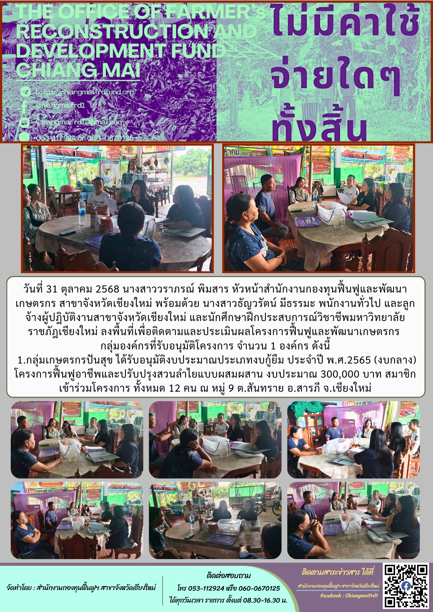 วันที่ 31 ตุลาคม 2568 นางสาววราภรณ์ พิมสาร หัวหน้าสำนักงานกองทุนฟื้นฟูและพัฒนาเกษตรกร สาขาจังหวัดเชียงใหม่ พร้อมด้วย นางสาวธัญวรัตน์ มีธรรมะ พนักงานทั่วไป และลูกจ้างผู้ปฎิบัติงานสาขาจังหวัดเชียงใหม่ และนักศึกษาฝึกประสบการณ์วิชาชีพมหาวิทยาลัยราชภัฎเชียงใหม่ ลงพื้นที่เพื่อติดตามและประเมินผลโครงการฟื้นฟูและพัฒนาเกษตรกร กลุ่มองค์กรที่รับอนุมัติโครงการ จำนวน 1 องค์กร ดังนี้