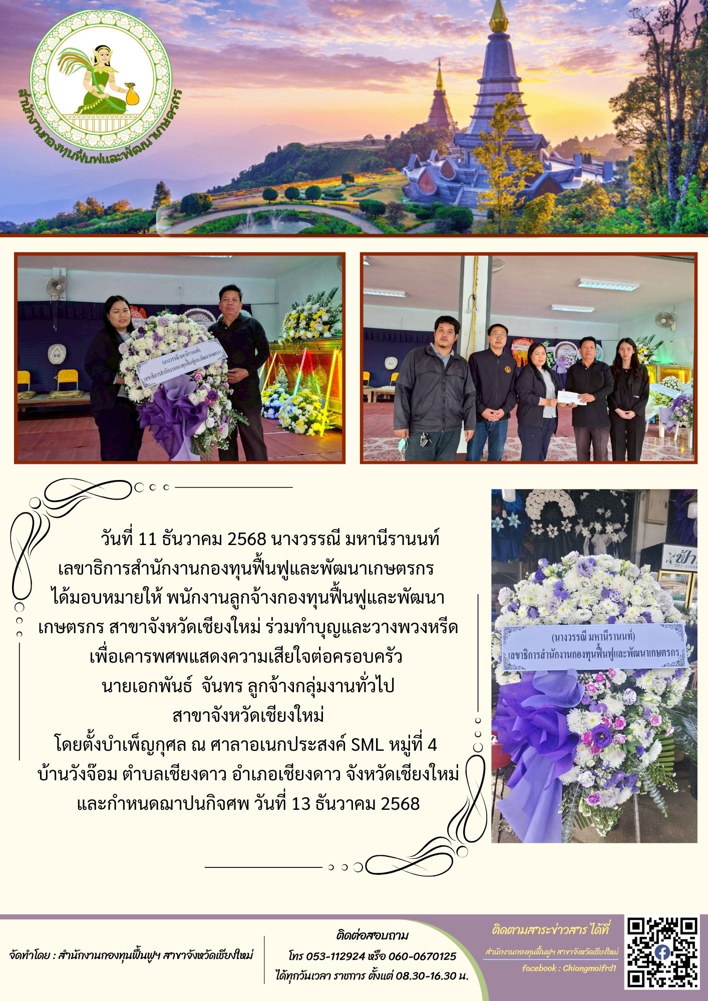 วันที่ 11 ธันวาคม 2568 นางวรรณี มหานีรานนท์ เลขาธิการสำนักงานกองทุนฟื้นฟูและพัฒนาเกษตรกร ร่วมทำบุญและวางพวงหรีดเพื่อเคารพศพแสดงความเสียใจต่อครอบครัว นายเอกพันธ์ จันทร ลูกจ้างกลุ่มงานทั่วไป สาขาจังหวัดเชียงใหม่